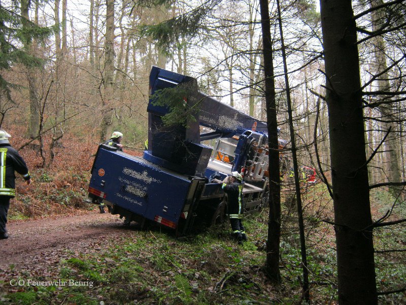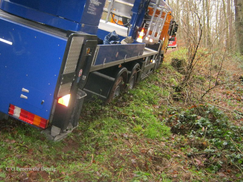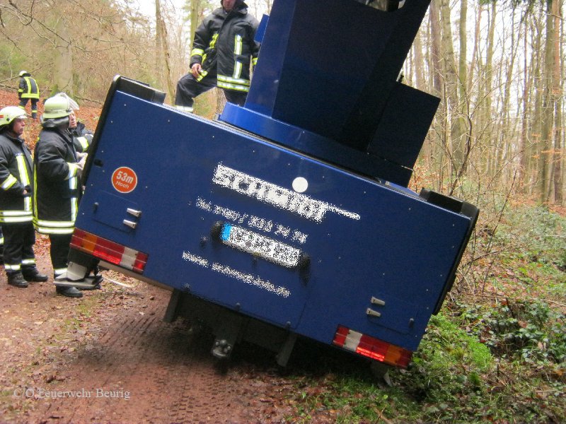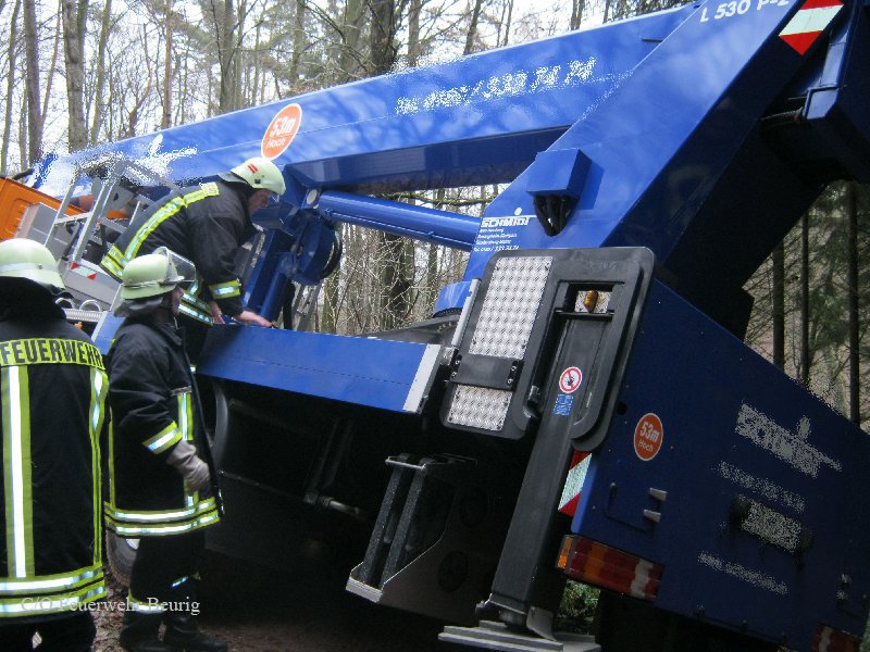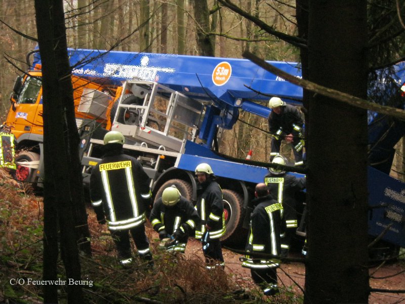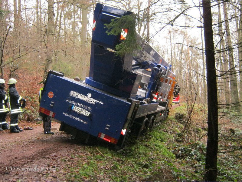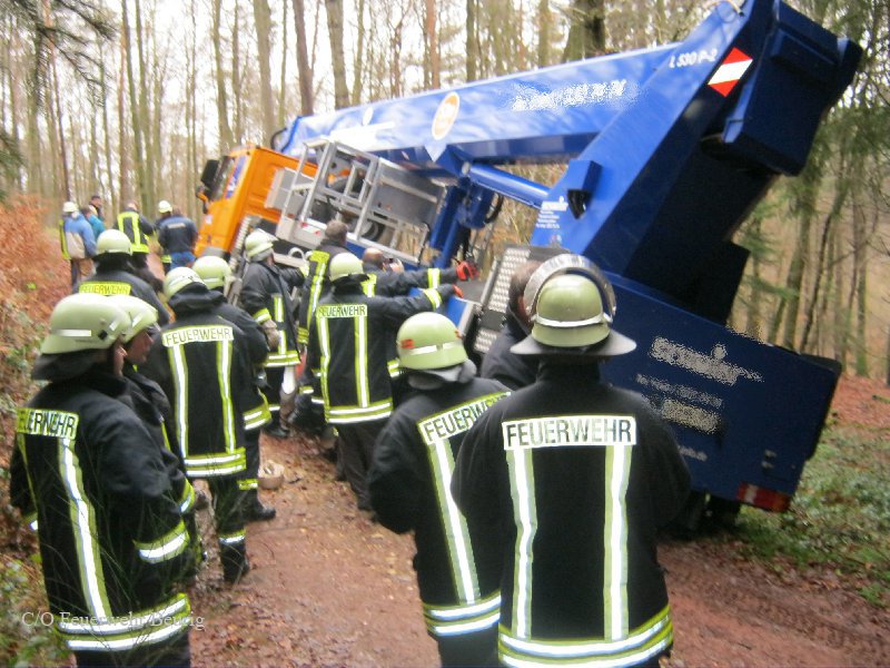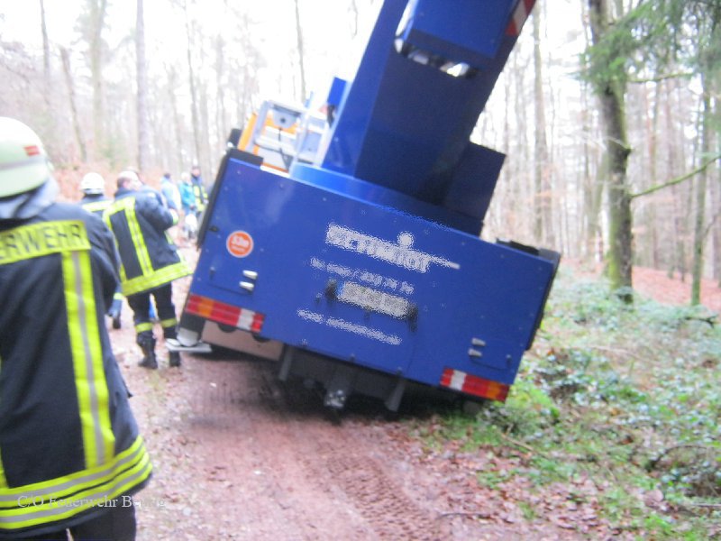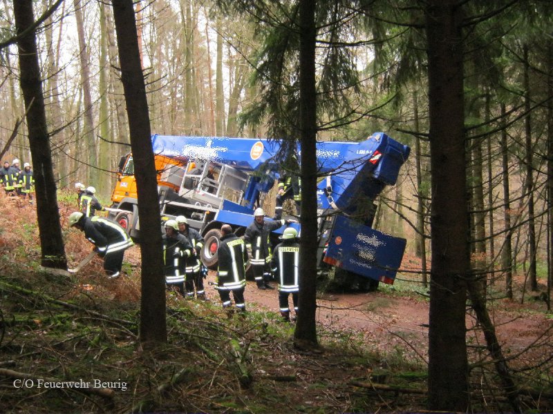 Um die Mittagszeit hatte sich ein LKW Fahrer auf der Suche nach einem Sendemast, in einem Waldstück bei Trassem verfahren. Als der LKW vom befestigten Weg abkam drohte er umzukippen. Mit der Seilwinde und Greifzügen wurde das Fahrzeug gesichert bis eine Spezialfirma vor Ort war um den LKW zu bergen. Im Einsatz waren die Feuerwehren aus Trassem, Saarburg und Beurig.
