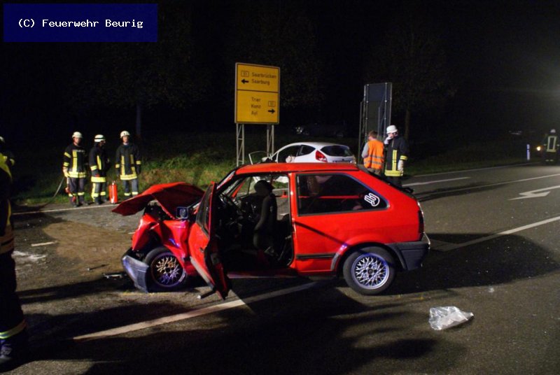 Im Kreuzungsbereich B 51/K 130 kurz vor Ayl kam es am Montag, den 27.10. gegen 17.30 Uhr zu einem Verkehrsunfall als ein Autofahrer von der K130 auf die B 51 einbiegen wollte und dabei einen aus Saarburg kommenden PKW übersah und ihm die Vorfahrt nahm. Die Fahrzeuge stießen frontal zusammen und beide Fahrer wurden schwer verletzt, jedoch nicht in Ihren Fahrzeugen eingeklemmt. Die Feuerwehren aus Beurig, Saarburg und Ayl übernahmen die Verkehrsabsicherung und Ausleuchtung bis die Unfallaufnahme abgeschlossen war und die Fahrzeuge abtransportiert wurden.