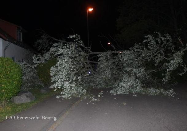 Um 04:35 Uhr wurde die Feuerwehr Beurig alarmiert. Eine Umgestürzte Birke hatte die Serriger Straße blockiert. Am Nachbarhaus Endstand leichter Sachschaden. Warum er Baum umfiel ist derzeit Unklar. Die Feuerwehr beseitigte den Baum damit die Straße wieder frei befahrbar war.