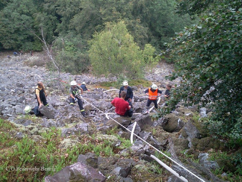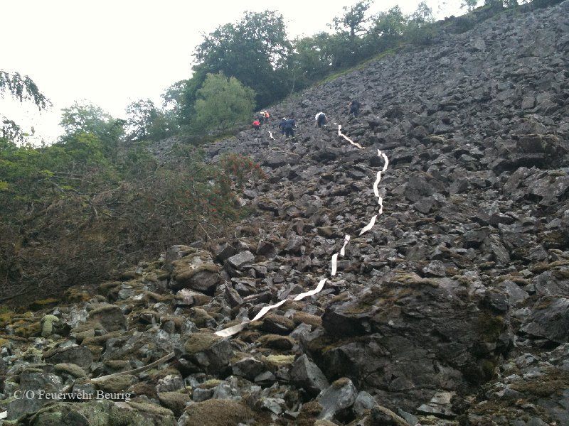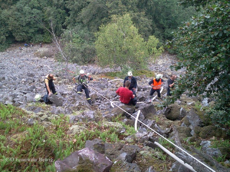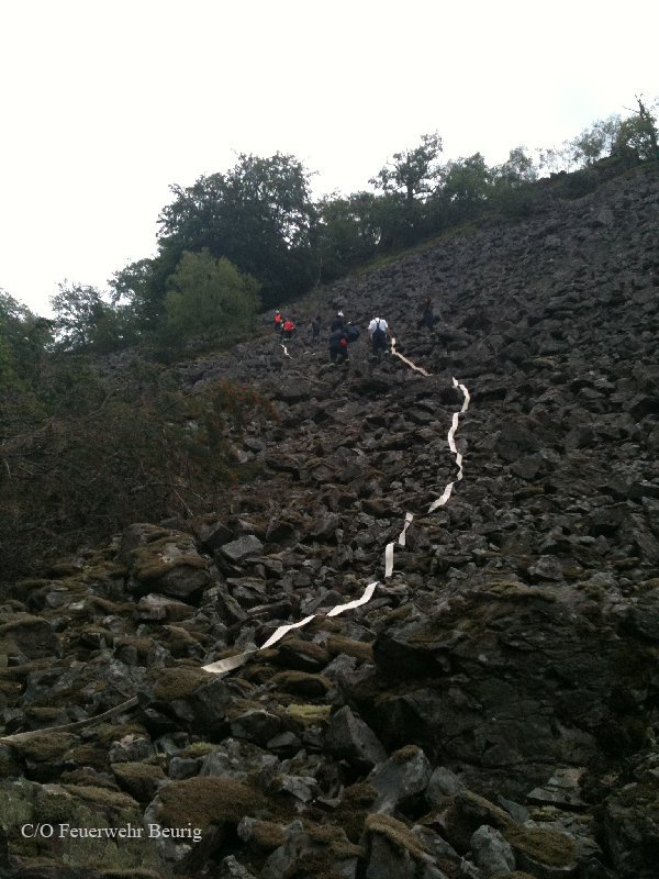 Der Alarm kam aus Kastel-Staadt. Gegen 13 Uhr hatten Anwohner gesehen, dass es auf dem Plateau am Gipfelkreuz zwischen Freudenburg und Taben-Rodt brennt. Die Feuerwehr Freudenburg musste sich zunächst zu Fuß aufmachen – dorthin führt nur ein Wanderweg. Mit Schaufeln und Hacken hielten die Wehrleute das Feuer in Schach, bis Verstärkung von unten kam. „Wir haben 800 Meter Schlauch über einen Steilhang gelegt“, sagte der stellvertretende Wehrleiter der Verbandsgemeinde (VG) Saarburg, Bernhard Hein . Die Saarburger Höhenretter sicherten von oben. Das Feuer war in Felsspalten ausgebrochen. Die Feuerwehr konnte verhindern, dass die Flammen auf den dichteren Wald übergriffen. Gegen 16.30 Uhr war das Feuer gelöscht. Neben der Freudenburger Feuerwehr und den Höhenrettern waren laut Hein die Wehren Taben-Rodt , Saarburg und Beurig sowie das DRK Taben-Rodt im Einsatz.