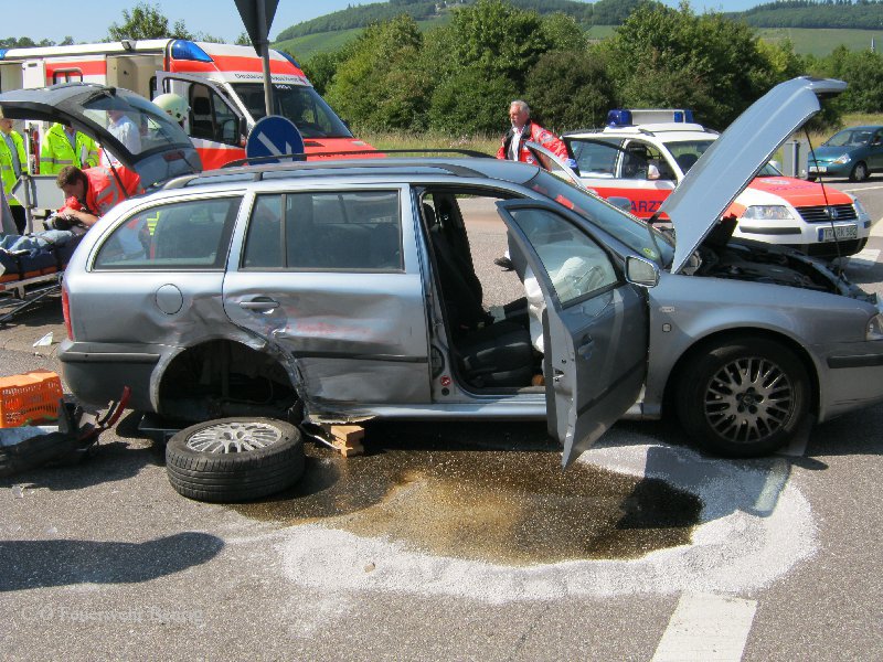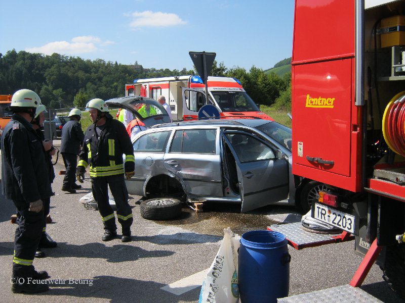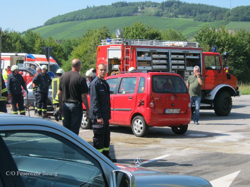 Auf der Kreuzung der B51 und der B407 in Saarburg Beurig kam es am Montag, den 01. August gegen 15:40 Uhr, zu einem schweren Verkehrsunfall mit zwei verletzten Personen. Wie es zu dem Unfall kam steht bis dato noch nicht eindeutig fest. Durch die Wucht des Aufpralls kippte der Kleinwagen auf die Fahrerseite um. Beherzte Ersthelfer nahmen die Fahrer aus den Fahrzeugen und betreuten sie bis zum Eintreffen des Notarztes. Die Feuerwehr fing die ausgelaufenen Betriebsstoffe auf und stellte das umgefallene Fahrzeug wieder auf die Räder. Nachdem die Straße gereinigt war, rückten alle eingesetzten Kräfte wieder ab. Im Einsatz waren die Löschzüge Mitte und Beurig, das DRK mit zwei Rettungswagen und Notarzt.