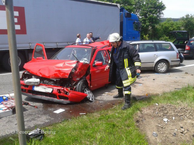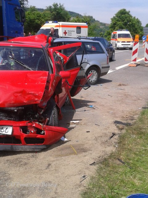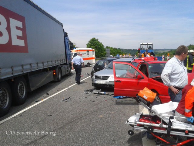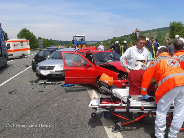 Der 58-jährige Fahrer, der selbst unversehrt blieb, rammte die stehenden Wagen und verletzte dabei fünf Menschen. Darunter war eine Frau, die mit ihrer elfjährigen Tochter in einem roten VW Golf am Stauende wartete, als der LKW ins Heck des Kombis hineinkrachte. Das Kind kam mit einem Halswirbelschleudertrauma davon. Zusammen mit ihrerMutter konnte das Mädchen das Kreiskrankenhaus in Saarburg nach einer ambulanten Behandlung verlassen.