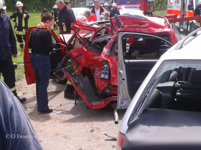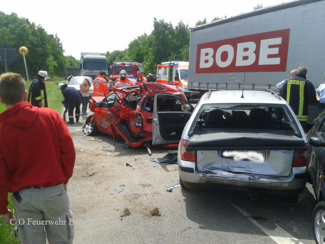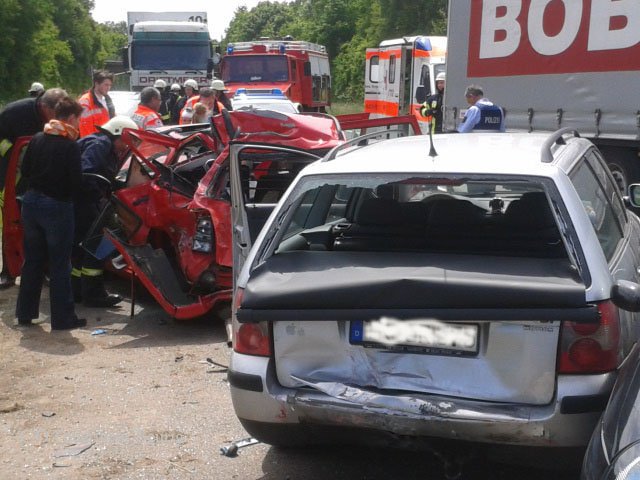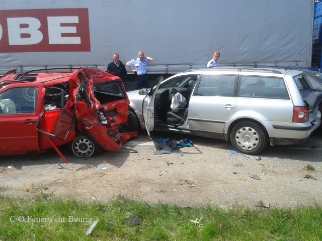 Der Lastwagen schob vier wartende Autos ineinander. Der rote Golf prallte gegen einen silbernen Passat Kombi, in dem eine 33-jährige Frau und ihr neunjähriger Sohn saßen. Beide wurden leicht verletzt. Der Golf wurde durch den Dominoeffekt nach dem schweren Aufprall auf einen Ford Ka geschleudert, dessen Fahrer zum Glück unverletzt blieb. Die Wucht des Aufpralls reichte aber, um den Ford Ka noch gegen einen weiteren Wagen zu schleudern. Die 44-jährige Beifahrerin eines Skoda Octavia wurde ebenfalls leicht verletzt. Der erste Wagen in der parkenden Autoschlange – direkt vor der Baustellenampel – kam aber mit einem Kratzer an der hinteren Stoßstange davon.