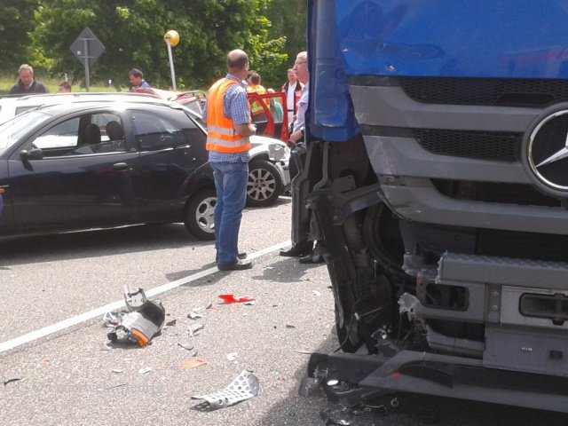 „Der war ungefähr 60 Kilometer pro Stunde schnell“, sagt der LKW-Fahrer Volker Huntemann, der mit seinem Lastwagen hinter dem 40-Tonner fuhr, der in die wartenden Autos raste. Der Fahrer dieses Lastwagens hatte vier Autos an einer Baustellenampel übersehen. Als er die rote Ampel auf der B.51 zwischen Ayl und Saarburg an der Abfahrt zur B.407 in Richtung Irsch am Montag um 13.10 Uhr bemerkte, war es schon zu spät.