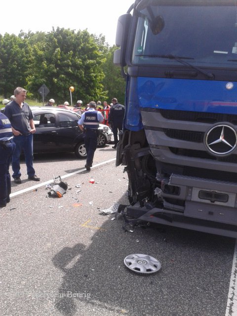 „Alle anderen Autos haben einen Totalschaden“, sagt Polizeikommissarin Silke Brausch. Die Polizei beziffert den Gesamtsachschaden auf etwa 30.000 Euro. Der LKW-Fahrer habe zwar noch versucht, auf die Gegenfahrbahn auszuweichen, das sei ihm aber nicht gelungen. Deswegen habe er den hintersten Wagen der Schlange mit der rechten Fahrzeugseite gerammt. Der Bremsweg des Brummis, den die Polizei vor Ort abmaß, betrug 29 Meter, reichte aber nicht aus, um den mit Fliesen beladenen 40-Tonner vor dem Aufprall zum Stehen zu bringen.