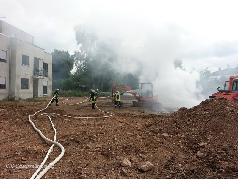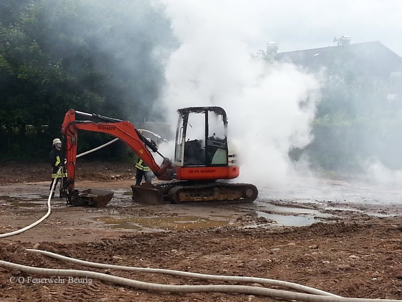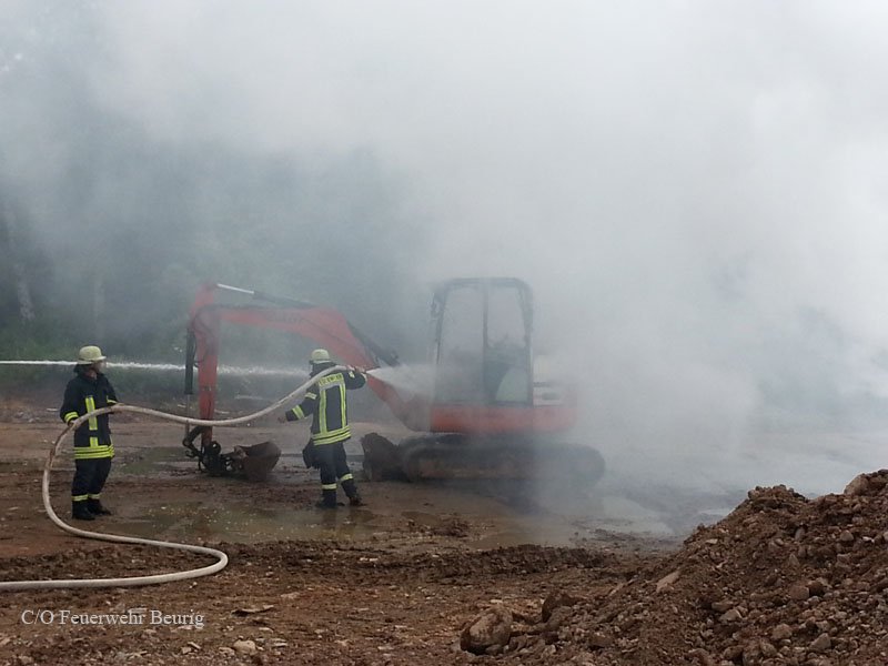 Am Donnerstag geriet in Saarburg-Beurig ein Bagger in Brand. Der Baggerfahrer bemerkte den Rauch und fuhr den Bagger vom Gebäude weg auf eine freie Fläche. Mit zwei C-Rohren wurde der Brand schnell gelöscht.