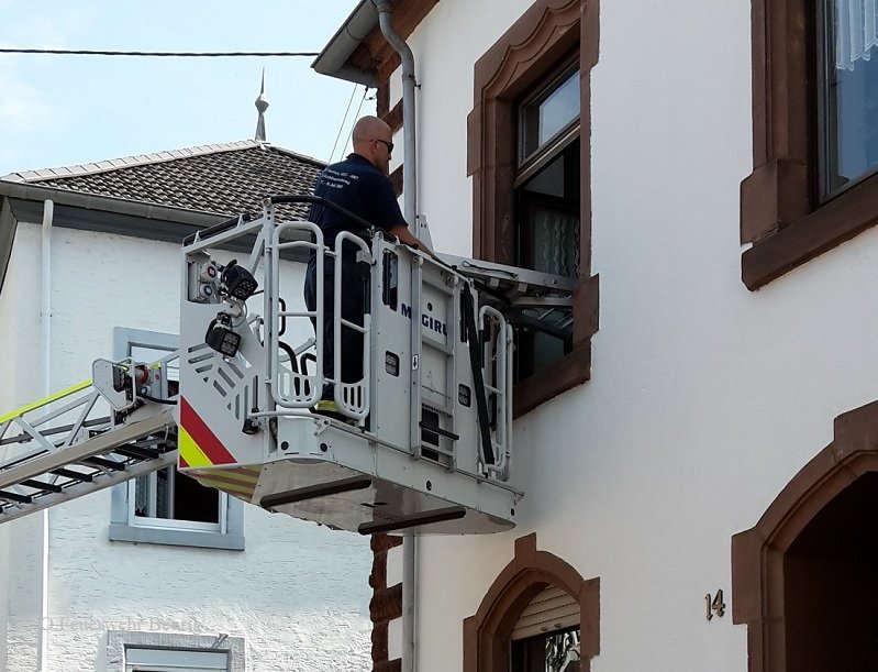 Gegen 14:20 Uhr wurden die Löschzüge Mitte und Beurig zur Unterstützung des DRK angefordert. Eine Person hatte sich schwer verletzt. Da das Treppenhaus zu schmal ist, musste die Person mittels Drehleiter gerettet werden.