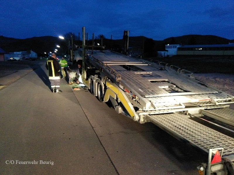 An einem Autotransporter war eine Hydraulikleitung geplatzt. Da die Firma, welche die Reparatur durchführte, nicht über genügend Ölbindemittel verfügte, alarmierte sie, gegen 18:45 Uhr, die Feuerwehr um das auslaufende Öl aufzufangen.